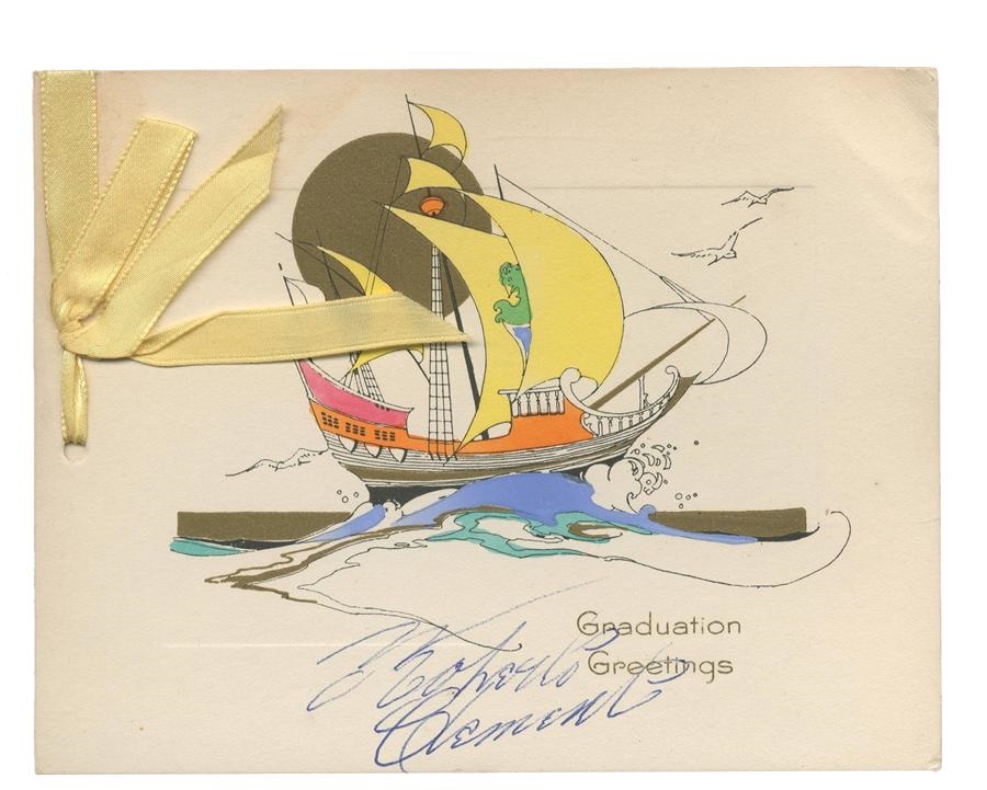 Though it's not clear exactly who the graduation honoree was, this 5.5" x 4.25" card with its colorful illustration showcases a beautiful signature (10/10) from early in the Hall of Fame outfielder's career. There's a yellow ribbon attached to the upper left corner. The Pride of Puerto Rico, Clemente played his entire, 18-year career with the Pittsburgh Pirates before he perished in a plane crash on the last day of 1972.