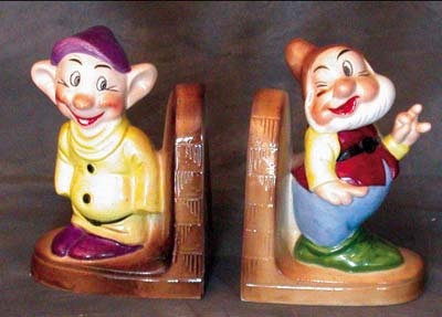 A pair of Dopey and Happy foreign ceramic bookends are possibly Lamode. They are rarely seen and NRMT condi-tion. Both have the origi-nal stickers as well.