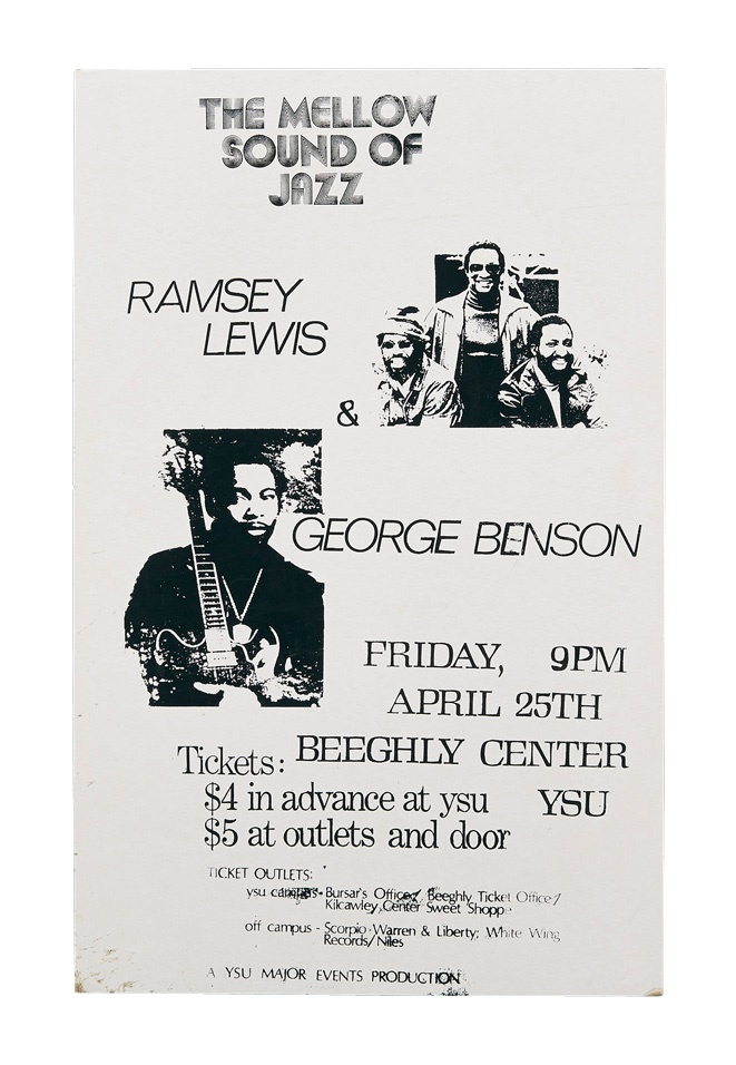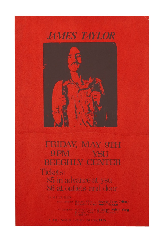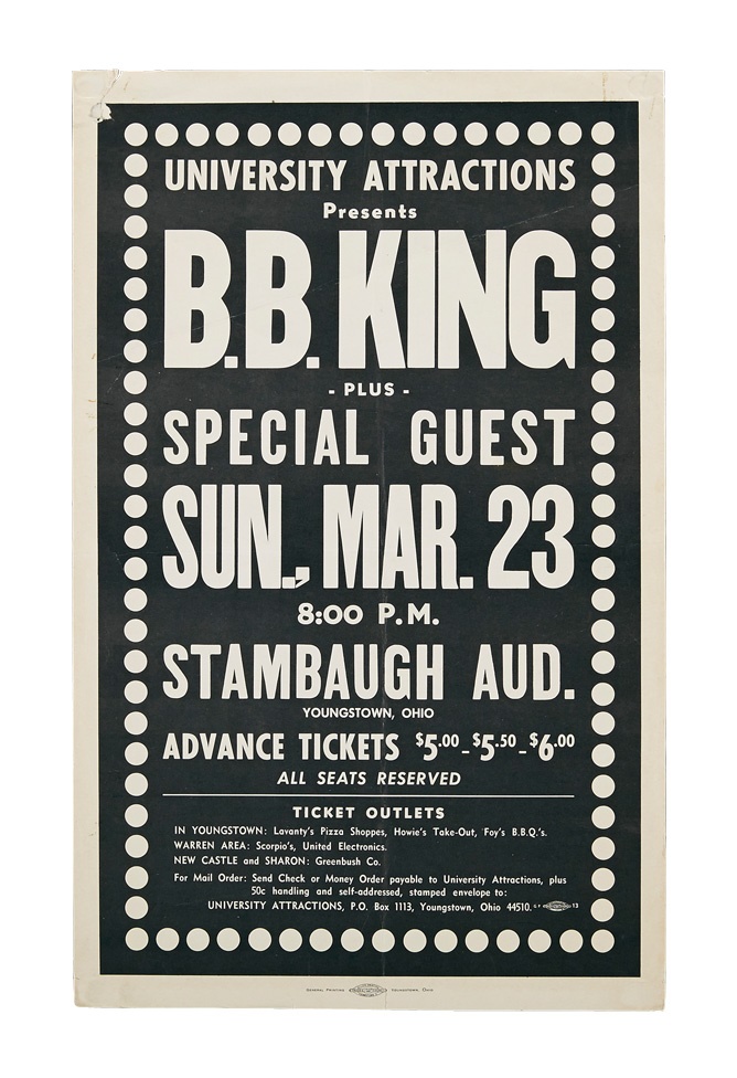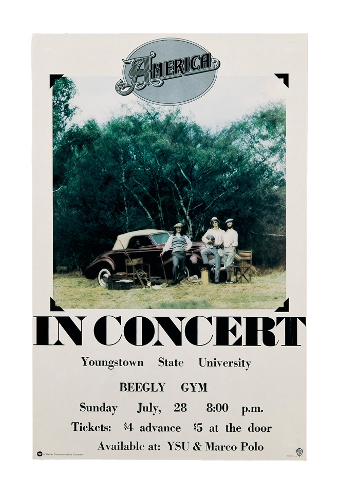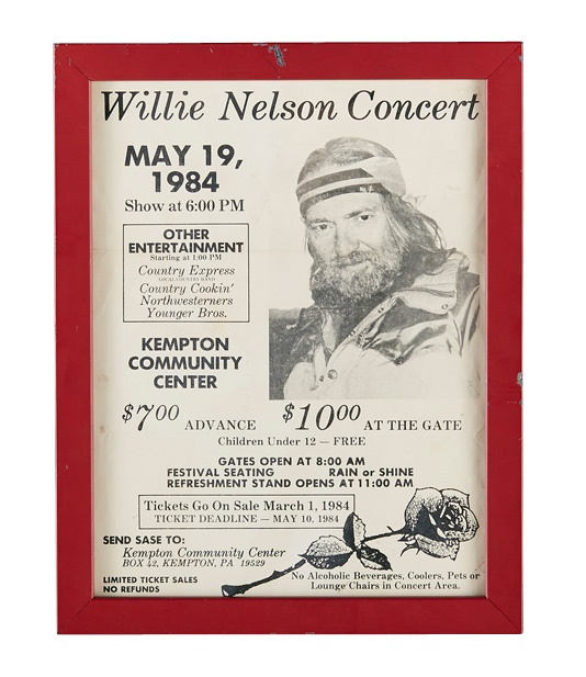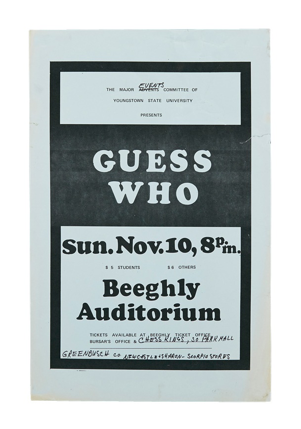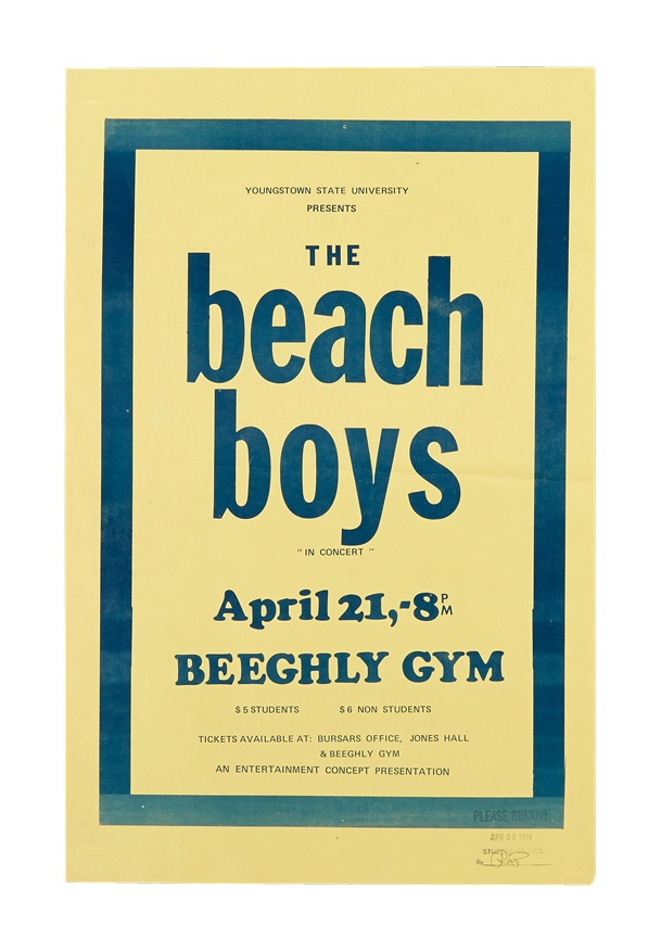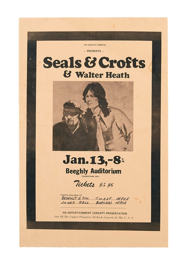 A cool collection of early vintage posters includes: 1984 Willie Nelson, 1960s Sonny James window card, Guess Who at Beeqhly Auditorium ('70s), 1960s James Taylor, Seats and Crofts, two 1970's America, 1970s BB King and Ramsey Lewis/George Benson. Best of all is a 1974 Beach Boys at Youngstown State University. Most are early-mid 1970s and many from Youngstown. Some rips, creasing and staining are evident but most are in VG-EX condition and the Nelson poster is framed.