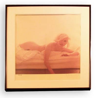 Huge and gorgeous photo of the ultimate blond bombshell was snapped by her most famous visual chronicler. Limited edition (191/250) shot is signed by Stern, with small blue stain in the white field at top that could be easily restored. A real stunner.