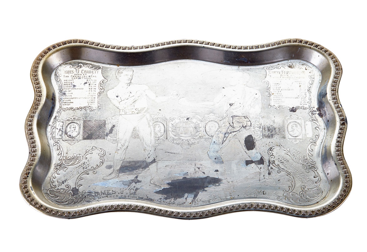 Some fabulous engravings highlight this duo "By permission of Richard K. Fox" of Police Gazette. The same masterful graphics appeared as a full color supplement in the magazine. This is one of the nicer specimens we have seen with deep, bold, crisp engraving. Heavily tarnished and measuring 14" x 10.25". Made in Finland.