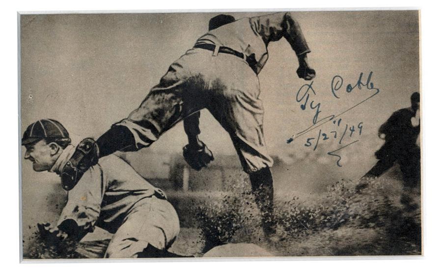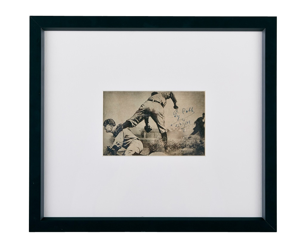 Positively the most desired signed baseball photo of all, this is the famed shot by Charles Conlon "Sliding in" spikes-up and energy as high as it would take him. The photo clearly defines Cobb, who played the game relentlessly, and - some would say, recklessly. Signed specimens are impossible and can reach six figures. This is a newspaper print, but looks great and is perfectly dated 5/24/49. The signature is near-perfect and electrifying. The photo itself is 4.25" x 6.5". Here's your chance to obtain an item that is usually out of reach for most. Beautifully framed and from an important baseball autograph collection we can trace back to the 1940s. Ty Cobb spent his entire, 22-year career with the Detroit Tigers, the last six of which he also wore the hat of manager. He received the highest percentage of votes in the inaugural Hall of Fame class with 222 out of a possible 226, proving that even back in the 1930s, there were still sportswriters who wouldn't vote anyone in on the first ballot.