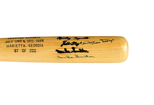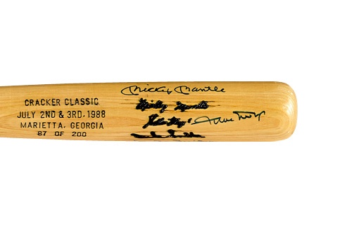 The terrific trio of center fielders that defined an era of New York City baseball individually signed this1988 Cracker Jack Classic limited edition bat, which is identified as number 87 of 200. The bat is NRMT while the signatures in blue Sharpie are at least 8/10.