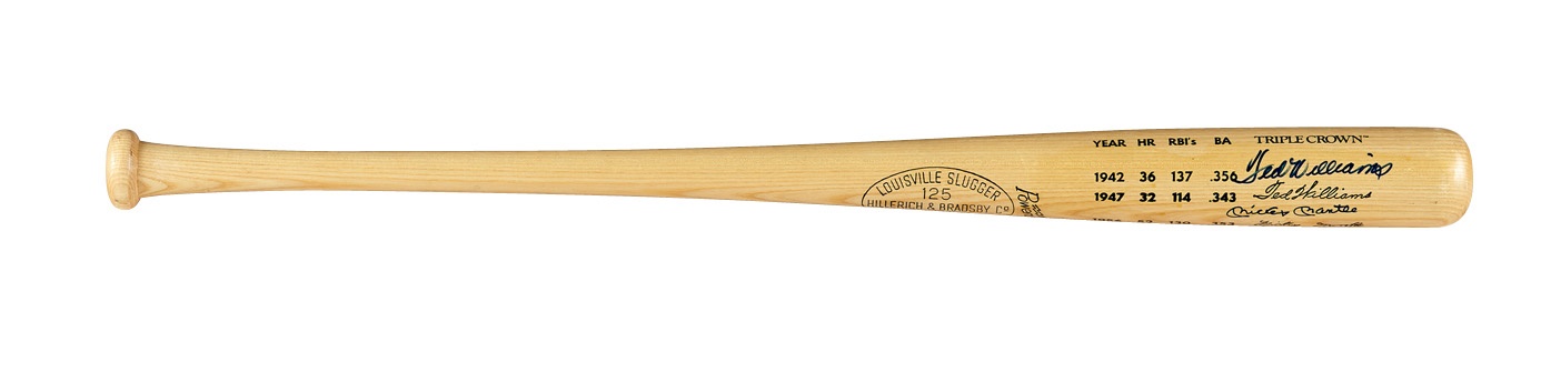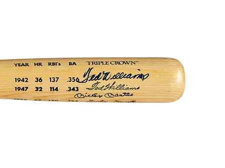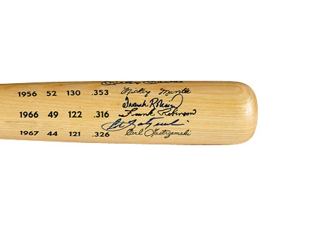 In 2012, Miguel Cabrera broke a long, 45-year drought in Triple Crown winners and he flirted with a repeat performance this past season before injury curtailed his effort. This special Hillerich & Bradsby bat celebrates the previous four triple crown winners - Hall of Famers Mickey Mantle, Ted Williams, Carl Yastrzemski and Frank Robinson. Each of the legends signed in 8/10 blue Sharpie on the barrel by their stamped signatures. A superb baseball keepsake!