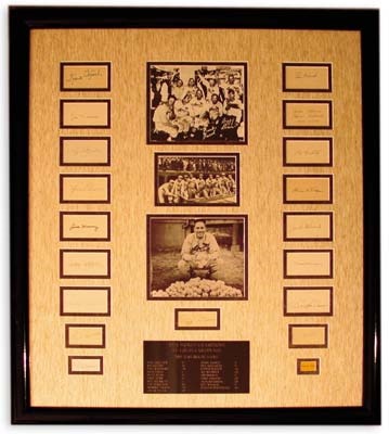 Nineteen individual signatures from the biggest stars of these World Champions (Frisch, Durocher, Martin, Medwick, Collins, Haines, Dizzy Dean) right on down to the benchwarmers. Each is nestled in its own hole cut in the pinstriped matting. Beautifully framed with photos of the team, most prominently Dizzy Dean. The care and preci-sion that went into the construction of the piece, not to mention the hours spent gathering the autographs, is truly astounding. NRMT. (35x40" framed)