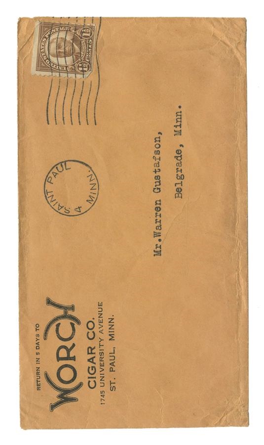 The cards from this series may be tough but the envelope is impossible. An original Worch cigar envelope from 1933 that housed a card set from the Worch Cigar Co. The tobacco-brown envelope has the Worch Cigar advertising in the upper left corner and has been posted. You can even see the outline where the cards spent the last 80 years. There are two small tape stains on the reverse from being in an old scrapbook. EX condition.