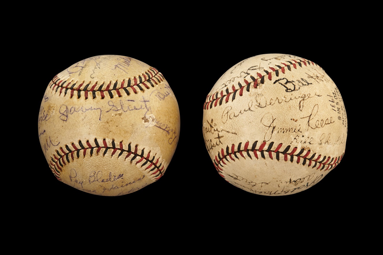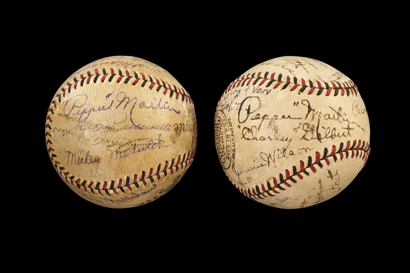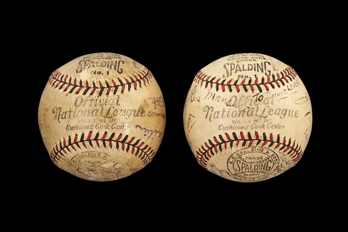 With a stellar, 101-53 record, the 1931 St. Louis Cardinals ran away with the National League pennant by 13 games. Between Chick Hafey and Jim Bottomley's bats, and a deep, dynamic pitching staff, the Cards were able to outlast the Philadelphia A's in a tight, seven-game series to win the Fall Classic, and these two official National League baseballs are terrific artifacts from that season.The 1931 ball is EX and features 16 signatures, some of which have been traced over (Bottomley is a clubhouse version). The 1932 ball is in VG condition and the 16 ink signatures average 5-6/10. Keys are Jesse Haines, Pepper Martin, "Ducky" Medwick, "Dizzy" Dean and Bottomley.