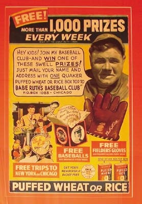 Magnificent diecut store display poster pictures charismatic image of the Babe in his Yankee cap and jacket. Circa 1935, it features many of the Babe Ruth premiums, including the Babe Ruth baseball celluloid pin and "Fielder's Glove." Wonderful image of Ruth on the back of a train advertises "Free Trips To New York and Chicago." Restoration to only the very top and very bottom has given it a beautiful VG-EX appearance. Professionally matted and framed.