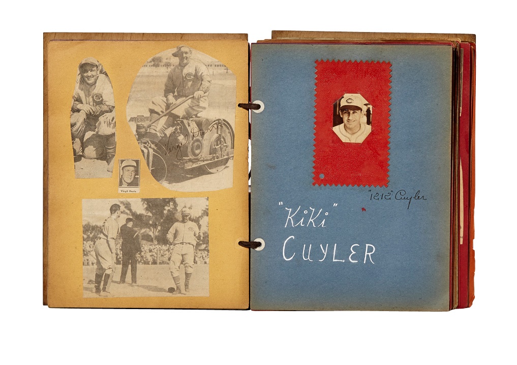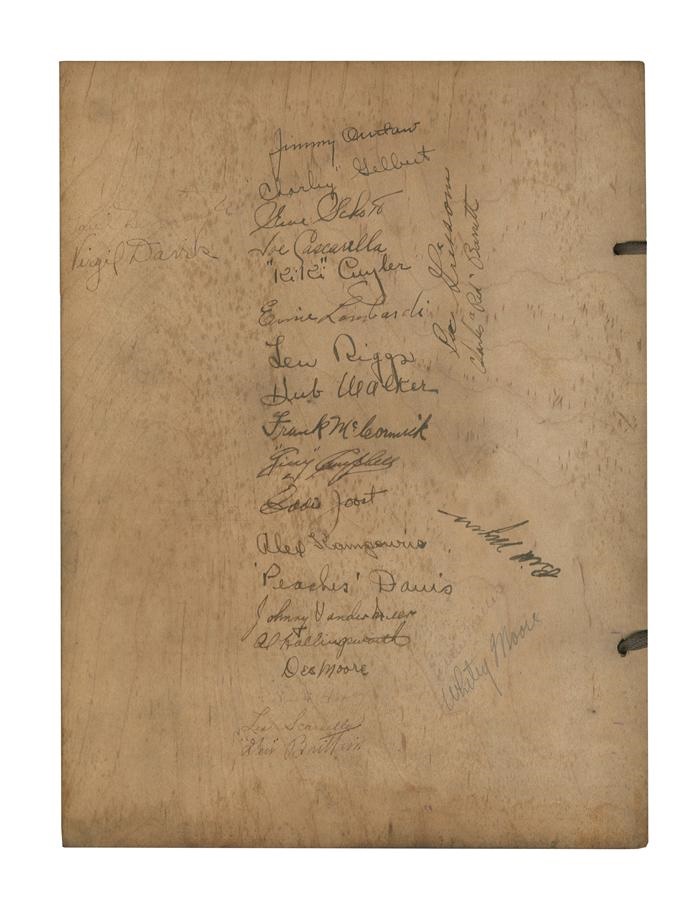 The 1936 Cincinnati Reds team was nothing to write home about, compiling a 74-80 record and finishing fifth in the National League, 18 games behind the pennant-winning Giants. However, this massive scrapbook detailing the club's ups and downs that season is truly first-rate. For starters, there are the hand-painted wood covers crafted by fan and artist Violet Ellis. The front cover is signed by the entire Redlegs team, including Hall of Famers Kiki Cuyler and Ernie Lombardi. And the inside ain't too shabby, either, highlighted by masterfully-fashioned single pages with photos mounted in swaths of leather. There are plenty of original and magazine photos, many of which are signed. There are several more Lombardi signatures inside and another Cuyler along with manager Chuck Dressen and some other real tough signatures. The overall condition is EX with many NRMT signatures.