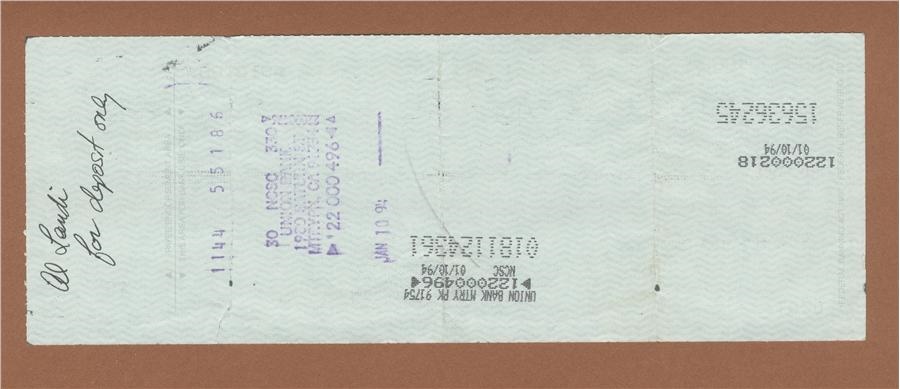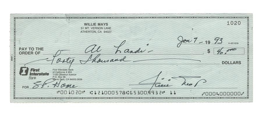 This check from Willie Mays' personal account was fliled out completely in his hand some 20 years after his final season as a major leaguer. It was issued through First Interstate Bank of Menlo Park, California on January 7, 1993 in the amount of $40,000. The signature and writing rate 8/10 in black ink. The check - whose memo reads "S.F. HOME" has some folds and grades EX. Mays was a 24-time All-Star, 12-time Gold Glover, two-time National League MVP and is widely regarded by many to have been the greatest all-around ballplayer.