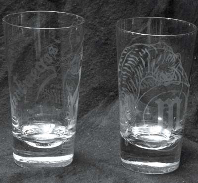 One that appears in no books or guides. Etched glass features the Marianao Tiger on one side and Coca Cola logo on the other. 5" tall and NRMT. Includes a matching Cienfuegos ele-phant glass with an American Association base-ball. Bid on the pair. Mint.