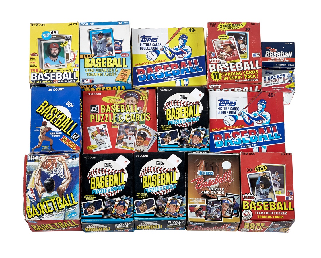 Some splendid sets here, including 1984 Football, 1989 Score Football (2) and 1986 USFL. Boxes include Donruss 1981, 1982, 1985 (3), 1986 with 3-Box Rack Case, 1987 and 1991 Studio. There are also Fleer 1981, 1982, 1983 and 1987, Topps 1982 Cello featuring Cal Ripken on top and 1983 Cello. There are rookie cards here of Eddie Murray, Rickey Henderson, Cal Ripken, Ryne Sandberg and Brett Hull. There's also a 1989 Fleer Basketball Wax Box. Average condition is NRMT.