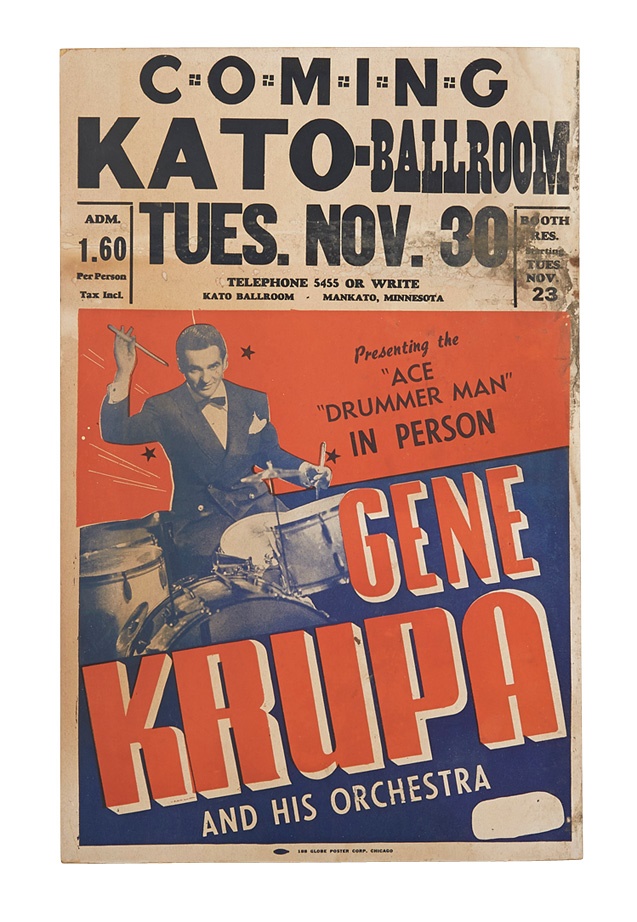 This rare Globe poster with great graphics showcases the flamboyant "Ace Drummer Man" who was one of the most charismatic of the Big Band leaders. Measuring 14" x 22", it is a bit dirty, but could be cleaned up/restored. That being said, Gene looks fine here. Note the admission price for the performance is $1.60 for the Kato Ballroom in Mankato, Minnesota.