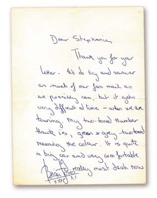 Brian Jones enjoyed answering his fan mail. A perfect example is this letter where Brian responds, "We try to answer as much fan mail as possible when not touring." The envelope is dated 1965. It is nicely signed by Brain with five kisses.