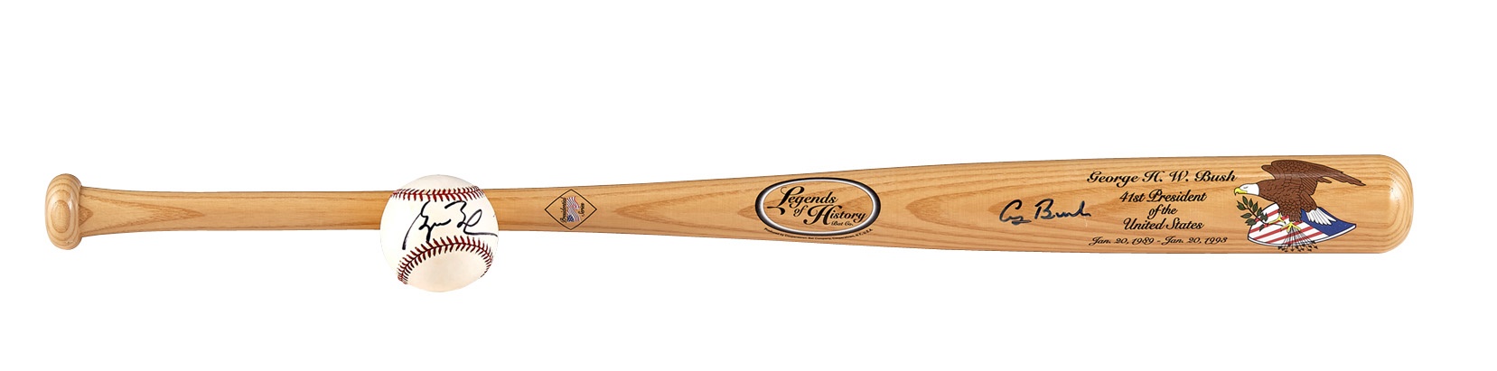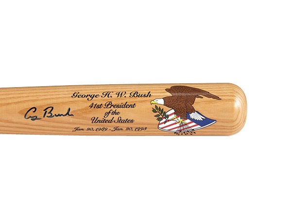 When it came to baseball and the White House, there was no beating the Bushes! George W. Bush was a one-time owner of the major leagues' Texas Rangers, while his father, George Herbert Walker Bush, played college ball at Yale and actually met Babe Ruth. This nifty bat and ball combo reflects the presidential family's love of the game. The bat comes from the special Legends of History from their Presidential Series and was signed by the elder Bush at a private appearance with the barrel signature grading 8/10 in blue Sharpie. The official American League baseball is NRMT and signed on the sweet spot in 9/10 black Sharpie by "W." It is also signed on side panels by former Arkansas Governor Mike Huckabee and Mississippi Governor Haley Barbour. Both signatures were obtained in person.