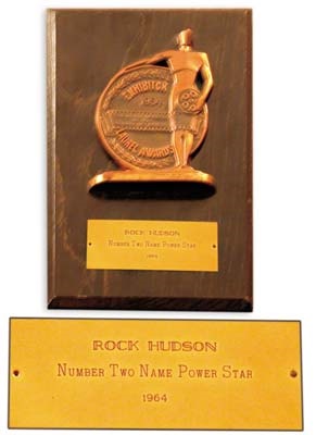 Weighty wall plaque was presented to the silver screen stud with an engraved brass plate reading, "Rock Hudson, Number Two Name Power Star, 1964." Personal items from this reclusive star are really tough, and awards are even tougher. NRMT.