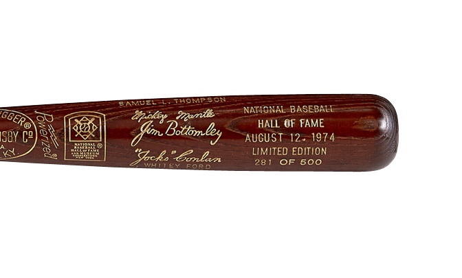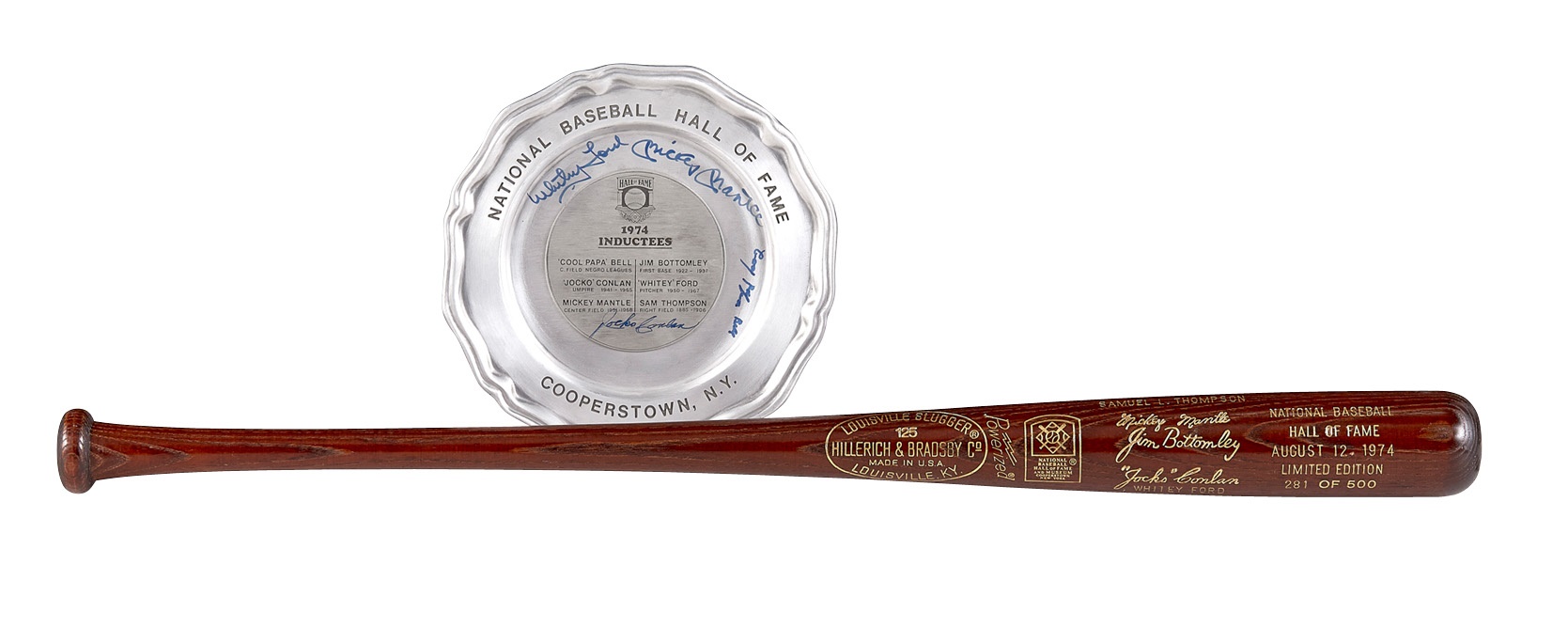 Baseball's 1974 Hall of Fame class featured Yankees legends Mickey Mantle and Whitey Ford, both of whom signed these two items that are in EX-MT condition. The Hillerich & Bradsby limited edition bat is numbered 281 out of 500 and includes the other inductees as well: Cool Papa Bell, Jim Bottomley, Samuel Thompson and umpire Jocko Conlon. The pewter plate is 9.5" wide and lists all six inductees in the center along with the Hall of Fame logo. There's also the following wording around the perimeter: "NATIONAL BASEBALL HALL OF FAME COOPERSTOWN, N.Y." Four of the six inductees signed the plate - Ford, Mantle, Bell and Conlon - in blue Sharpie rate 7-8/10.