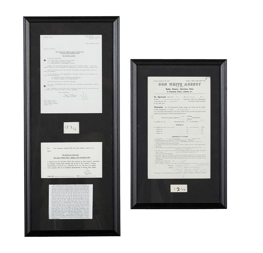 Imagine a day when the Rolling Stones were an opening act. Back on September 15, 1963, just one year after the band formed in England, Mick Jagger and the boys prefaced another relatively new band known as The Beatles at the Pop Prom. Offered here is the contract (file copy) from that Sunday elite event at the Albert Hall. The contract and other documents, including a magazine excerpt, are framed, measuring 12" x 27". The second is dated November 7 for a February 1, 1964 performance through the Don White Agency that would pay the band a whopping salary of 150 pounds for the night. It measures 12" x 18". Both are in NRMT condition.