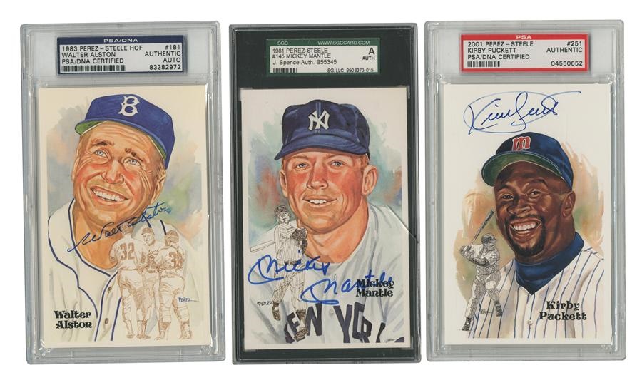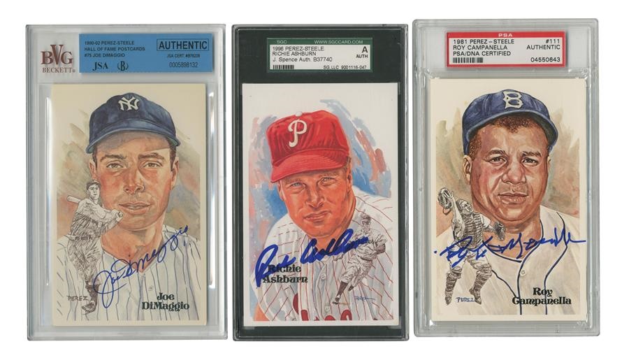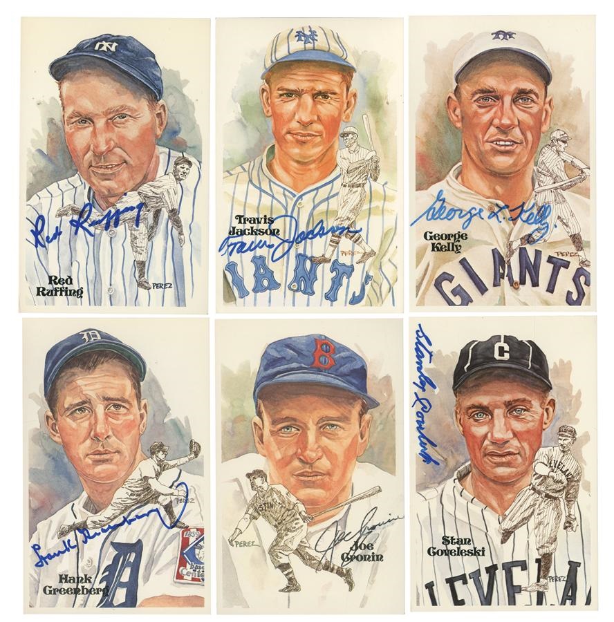Countless hours were clearly invested in assembling this complete set of Perez-Steele Hall of Fame postcards. One collector is responsible for gathering these in-person signatures, making up one of the finest signed sets we have ever seen. There are signatures on all that could have possibly been signed with the exception of two-Satchel Paige and Lloyd Waner cards. All the others are here and signed. And of those, 28 are slabbed (most by PSA). The postcards are in NRMT condition with the signatures averaging 8-9/10. The following include JSA letters: Hank Greenberg, Red Ruffing, Joe Cronin, Stan Coveleski, Ted Lyons, and Ralph Terry.