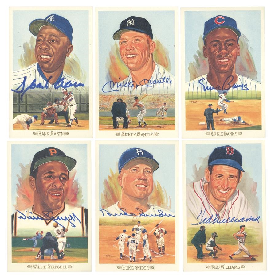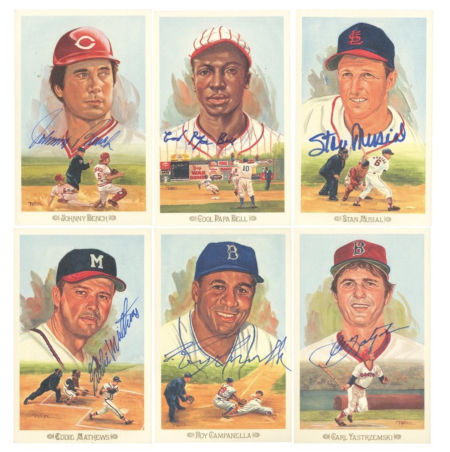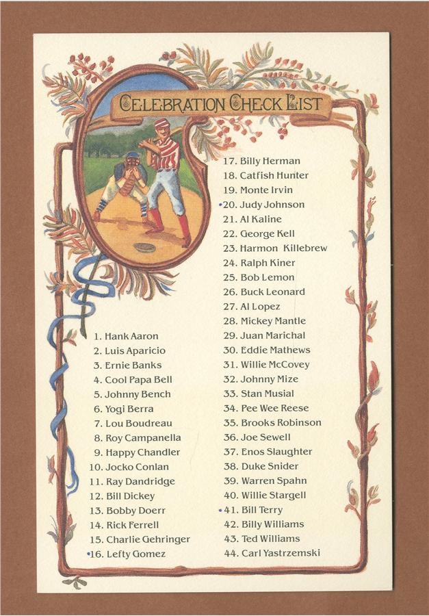The Perez-Steele Celebration set was issued in 1989 to commemorate the 50th anniversary of the Baseball Hall of Fame, and this is a fantastic set with 41 out of the 44 players that could have possibly signed doing the honors (missing only Lefty Gomez, Judy Johnson and Ralph Terry). It comes with the original green slipcase, box and booklet as they were assembled by one collector with most of the signatures having been obtained in person. The cards are NRMT while the signatures grade 8/10 or better. The Roy Campanella card comes with JSA LOA and Jocko Conlan has a copy of a note sent back when he signed a group of cards.