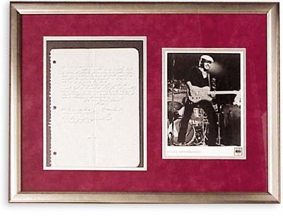 Regards the house he rented in Long Branch, New Jersey in 1974-75 where he composed the songs that would become his breakthrough album Born To Run. 8x11" letter by Bruce to his landlady postmarked May 8, 1975. To quote: Dear Landlordess, This is the only water bill I have. I think there was one other one but it wasn't much and I took care of it myself. Anyway, they haven't sent any notices so I guess it's o.k. Sorry the rent is late this month but I forgot to tell the office in N.Y. that they were gonna send it out. If you don't have it now it's in the mail and should arrive tomorrow or the next day. Your ever gracious tenant, Bruce Springsteen. P.S. do you like this classy writing paper? P.S.S. I'm practicing my auto-graph, whadya think?" Bruce was on the threshold of national stardom and the rent was late! Fascinating notation about the practicing of his autograph. Letter is framed and matted to 19x25" with original 1975 CBS promotional still. Includes the original handwritten envelope, which is a bit worn. Letter has folds but the ink is nice and is on the written on the same spiral notebook paper on which he composed the songs featured on Born To Run. Very few Springsteen handwritten letters are known in collector's hands, let alone one with this interesting content.
