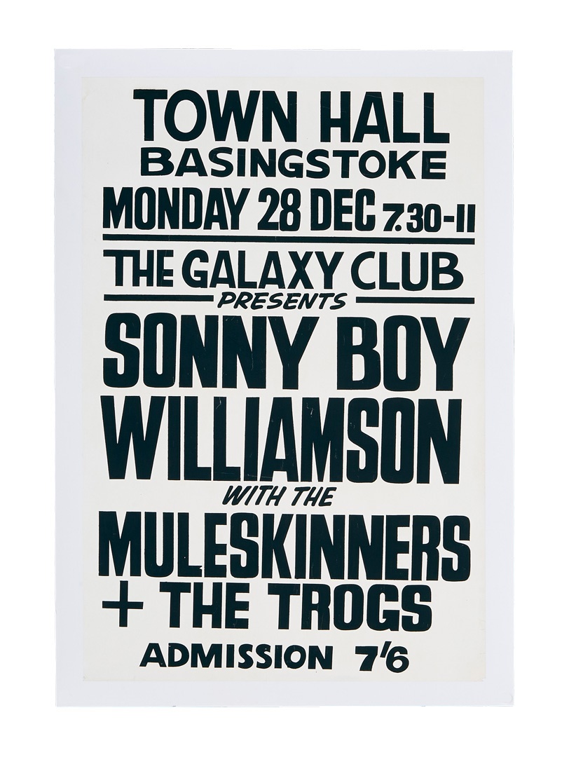 Alex Miller - otherwise known as Sonny Boy Williamson - brought his blues harmonica across the big pond from his native Mississippi to the Galaxy Club in England for a Christmas-week show in 1964. This poster mounted on linen heralds the performance in bold block letters, along with the Muleskinners and the Troggs, who formed that year and whose name was missing a "G" here. Measures 23" x 33.5" and is in NRMT condition.