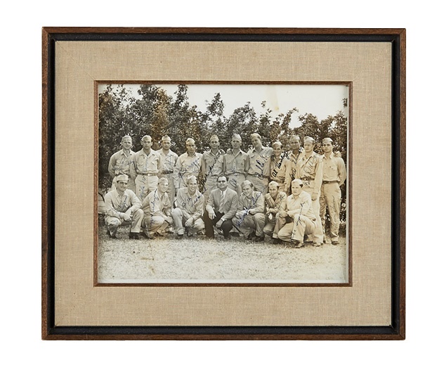 Not only were 1940s-era baseball stars such as Joe DiMaggio leaders on the field, they also bravely served their country in its time of need. Case in point, this gorgeous image of the Army baseball team with a perfect Joe DiMaggio signature. Overall, 17 servicemen signed the terrific photo, most of whom were major leaguers, including Yankees teammate Charlie Silvera. Framed and matted, the actual photo is 9 3/4" x 7 5/8". There is a stain and slight crease, but neither affects Joe, whose signature is near-perfect.