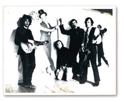 The only specimen known of this early promotional from one of his earliest bands. Formed in 1969 with Vini Lopez, Danny Federici and Vinnie Roslin. This photo was taken at the Pandemonium Club where they first performed Bruce's original music in 1969. These were produced by their man-ager Tinker West and it is the only such 8x10 to survive. Fred Astaire and Ginger Rogers are shown in the back-ground but they were not in the band. EX.
