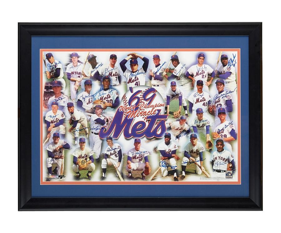 The Yankees may have 25 more World Series trophies than their crosstown rivals in Queens, but the Mets arguably have the most memorable of them all, having shocked the world in 1969. Not only did they experience their first-ever winning season, but they sprinting away from the pack late in the year en route to 100 wins, then swept Atlanta in the first-ever NLCS before polishing off a miraculous five-game triumph over the heavily-favored Baltimore Orioles for the crown. This gorgeous, substantial framed poster features 28 signatures from the first expansion team ever to win the Fall Classic, all painstakingly accumulated by a collector. Each name was autographed in blue Sharpie and rates a perfect 10/10. Among the names are Nolan Ryan, Tom Seaver, Yogi Berra, Ed Kranepool, Tommie Agee, Donn Clendenon and Tug McGraw. It measures 43" x 33". Simply amazin'!