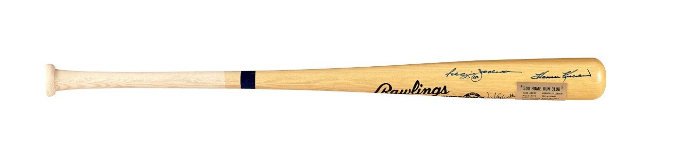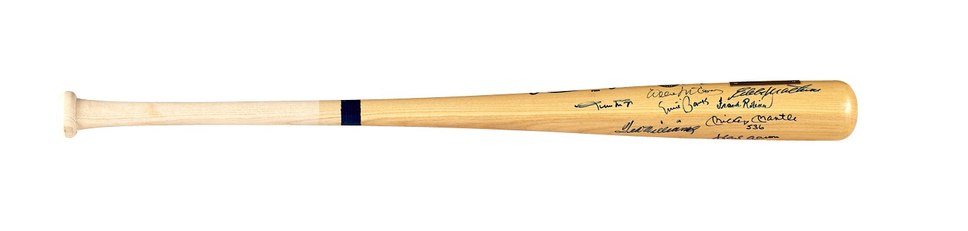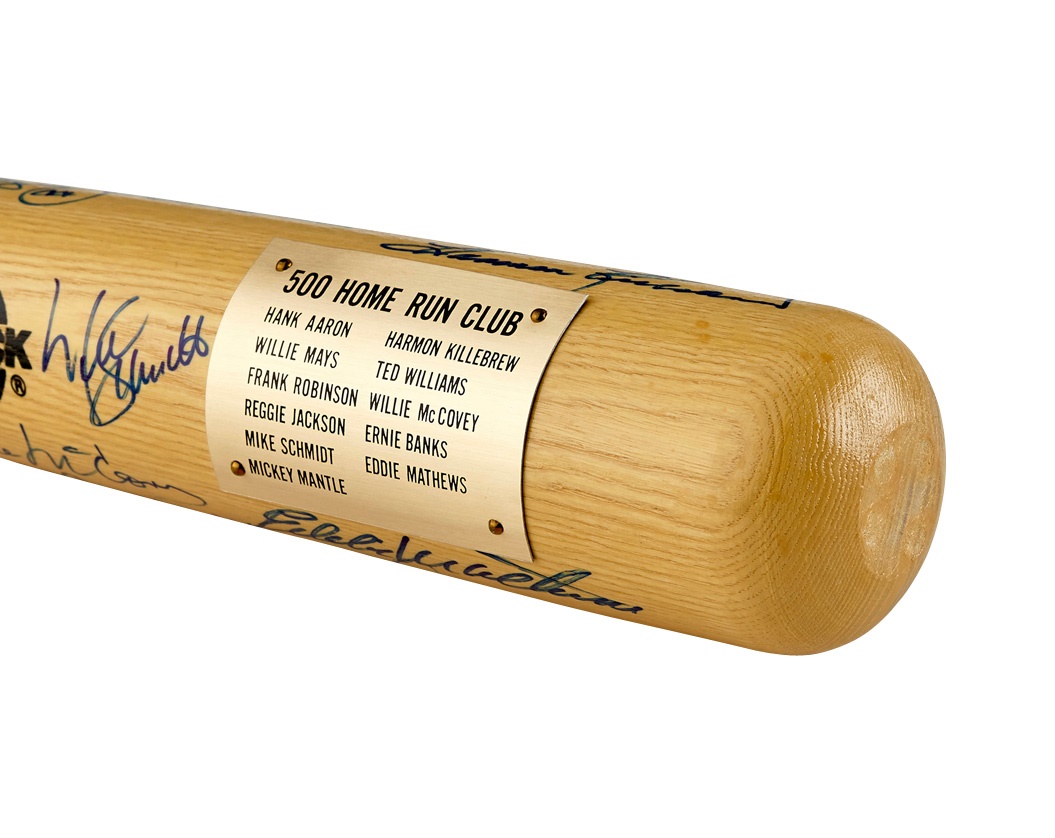 Eleven members of the exclusive 500-Home Run Club signed this Rawlings Adirondack bat with average 9/10 quality. Mickey Mantle added his home run total. The prolific sluggers signed at their first gathering in Atlantic City. Comes with a brass plaque on the front naming the signees: Mantle, Aaron, Mays, Frank Robinson, Jackson, Schmidt, Killebrew, Ted Williams, McCovey, Mathews and Banks. On August 11, 1929, Babe Ruth became the charter member of the club and Gary Sheffield is the 25th and most recent member, having blasted his 500th as a Met on April 17, 2009.