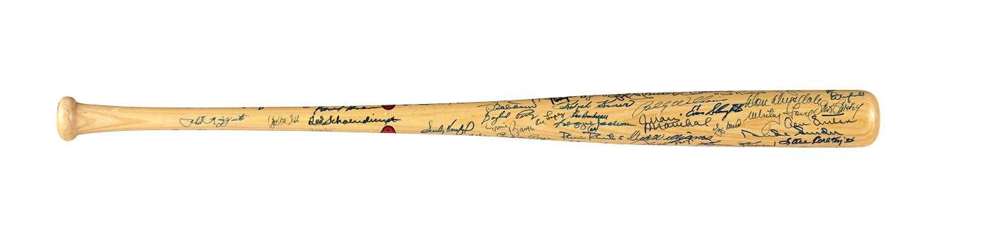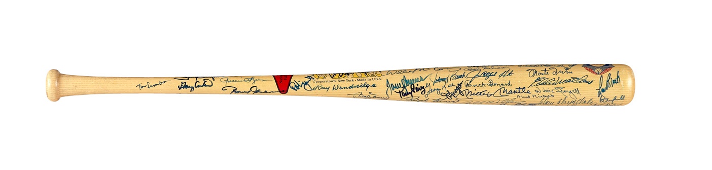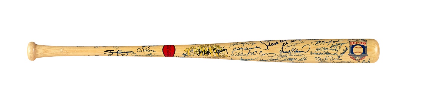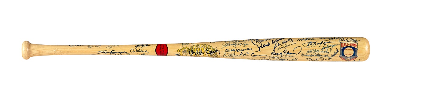 The signatures on this Cooperstown company bat are a proverbial Who's Who of Hall of Fame sluggers, including many who are now deceased. These include Mickey Mantle, Duke Snider, Harmon Killebrew, Enos Slaughter, Billy Williams, Stan Musial, Pee Wee Reese, Bob Feller and Warren Spahn. Other names include Whitey Ford, Juan Marichal, Sandy Koufax, Ernie Banks (2), Hank Aaron, Jim Palmer, Reggie Jackson, Yogi Berra, Paul Molitor, George Brett, Robin Yount, Willie McCovey, Willie Stargell and Frank Robinson, just to scratch the surface. The mostly blue Sharpie signatures average 9 out of 10. A terrific bat with which to continue your collection.