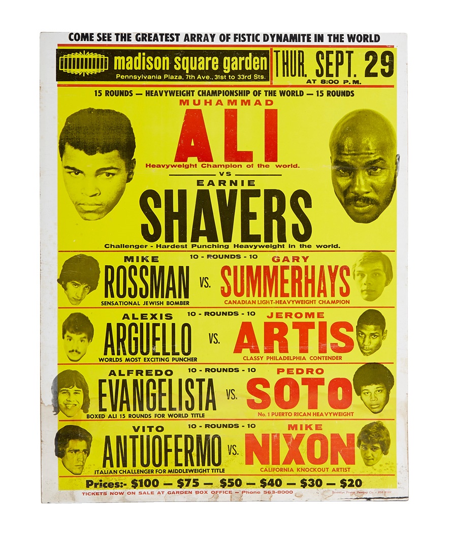On September 29, 1977 at New York's Madison Square Garden, Heavyweight Champion Muhammad Ali defended his title against tough challenger Earnie Shavers. Ali won a close, 15-round decision after having been wobbled in the 2nd and 14th rounds. The fight was a huge financial success as the Garden was sold out and NBC, which televised it live, had incredible ratings, a tribute to Ali's drawing power. Offered here is an original, on-site poster to this event, consisting of cardboard mounted on heavy board and picturing the fighters in bold color and clear images. There is staining and soiling along the bottom, along with some warping from water damage and edge and surface wear. It measures 23" x 29" and is a seldom-seen artifact.