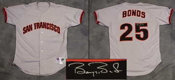 Gorgeous San Francisco Giants road jersey is from a friend of Barry Bonds. Perfect and important tagging with the Russell Athletic size 44 and the key 100% Polyester flag tag as well. Jersey is autographed on the "5" on the verso by Barry (mint). Shows no use but is exactly like the game used ones.