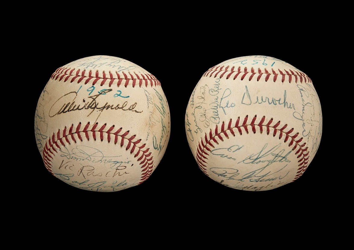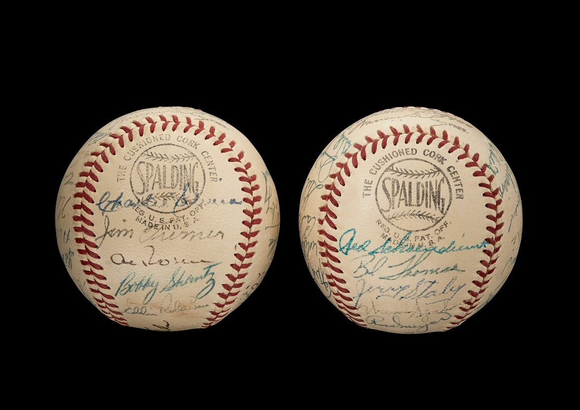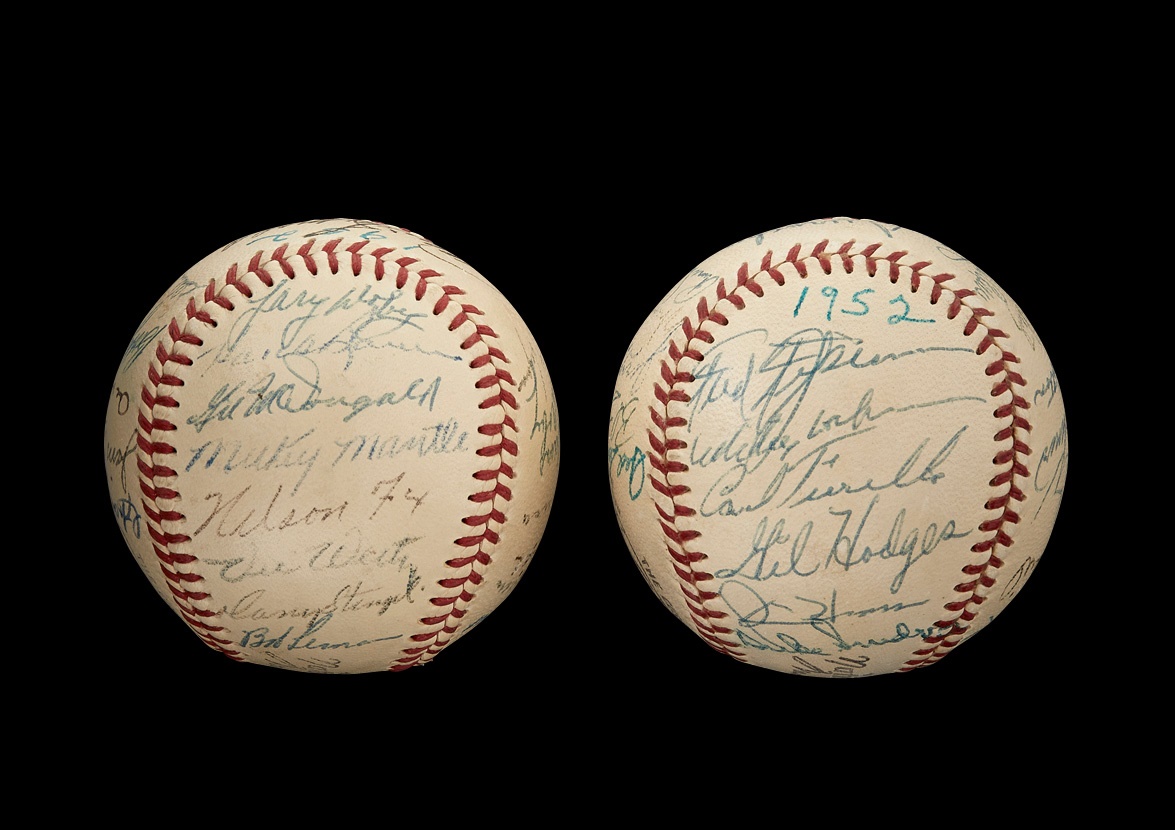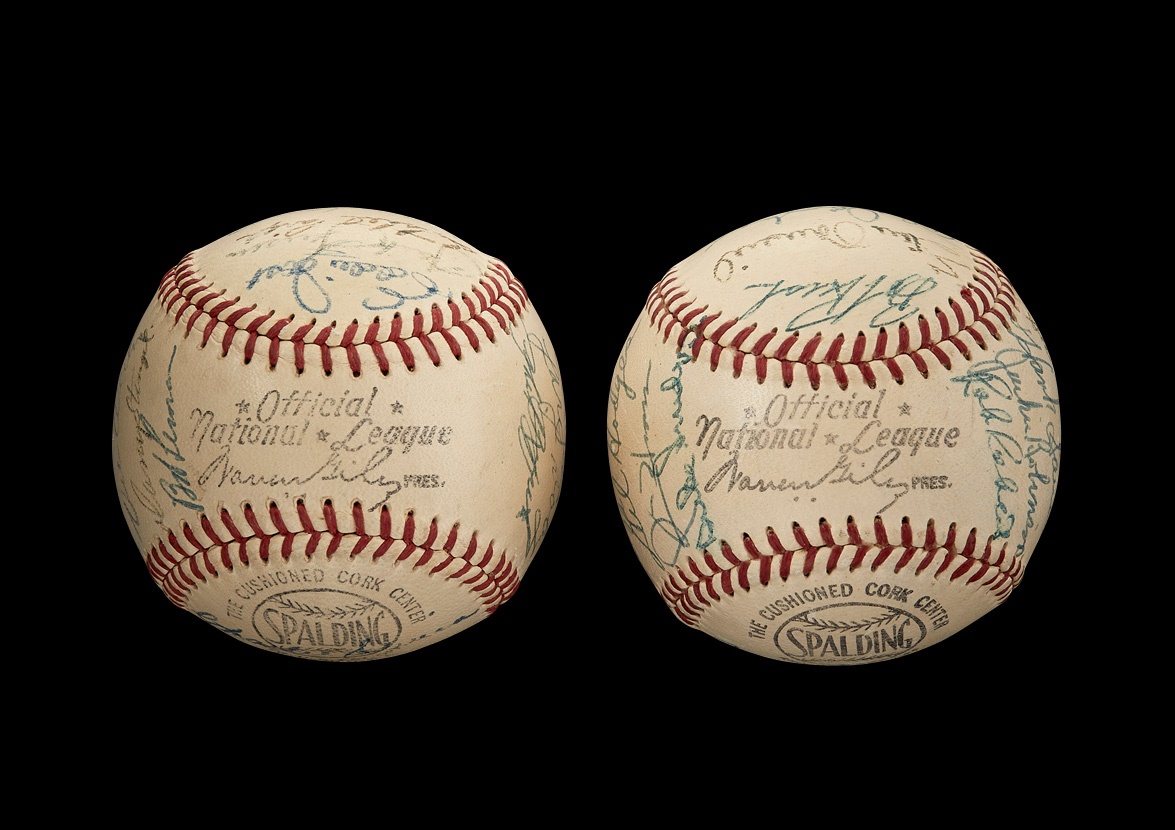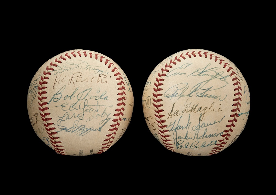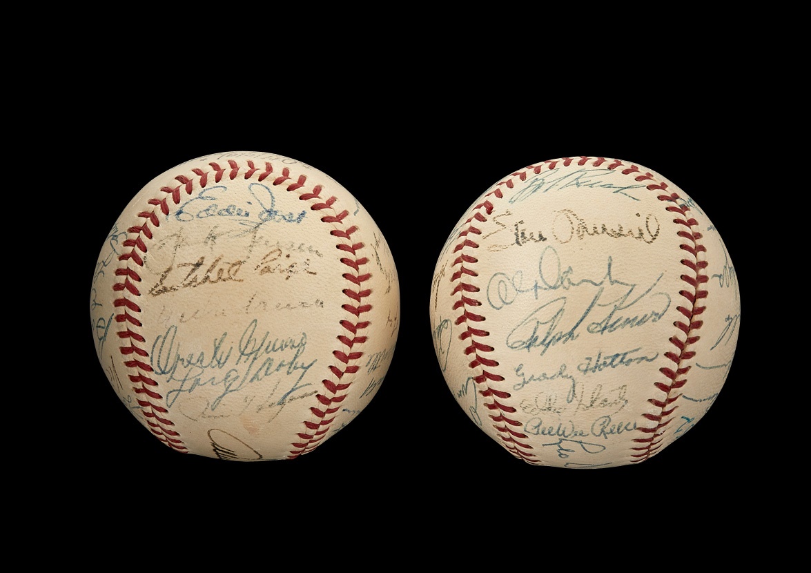 The only All-Star Game ever shortened by rain occurred in 1952 at Philadelphia's Shibe Park. After five full innings of play, the National League led the American League, 3-2, and that would turn out to be the final score as the skies opened and a long downpour ensued. These two official National League (Giles) baseballs commemorate that unorthodox game and are in EX-MT+ condition. One ball features 27 signatures while the other boasts 25, with "1952" also inscribed on each. Among the key names are: Jackie Robinson, Enos Slaughter, Gil Hodges, Duke Snider, Carl Furillo, Stan Musial, Ralph Kiner, Pee Wee Reese, Leo Durocher, Red Shoendienst, Warren Spahn, Satchel Paige, Larry Doby, Mickey Mantle, Nellie Fox, Casey Stengel, Bob Lemon and Phil Rizzuto, The signatures in ink average 7.5/10 with a few that have faded a bit more.