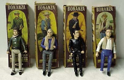 This set of four dolls or action figures (whichever you pre-fer) is phenomenally rare, especially with the original boxes. Made in Portugal by Palitoy, a London-based company. Set of dolls includes the Outlaw, instead of Adam, as Pernell Roberts had already left the show. The dolls are of Ben, Hoss, Little Joe, and the Outlaw. Boxes are 11" tall and the dolls 8". Dolls and boxes are EX. Dolls come with many little pieces and a few are missing. Each doll comes with a catalog of all the accessories and vehicles you could buy.