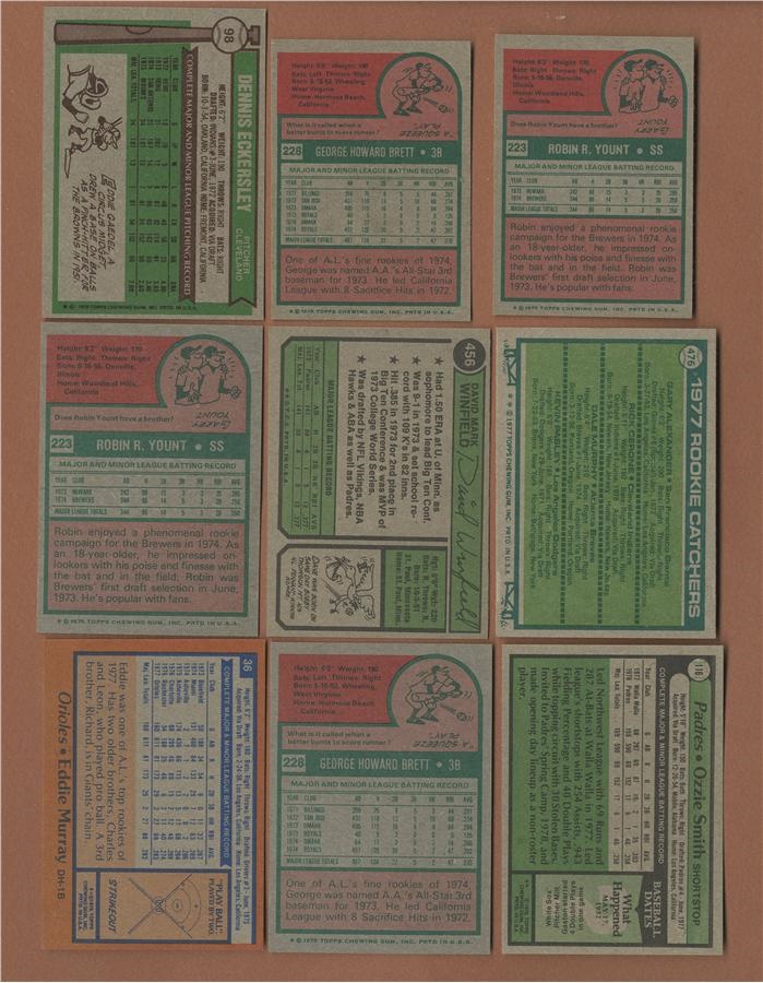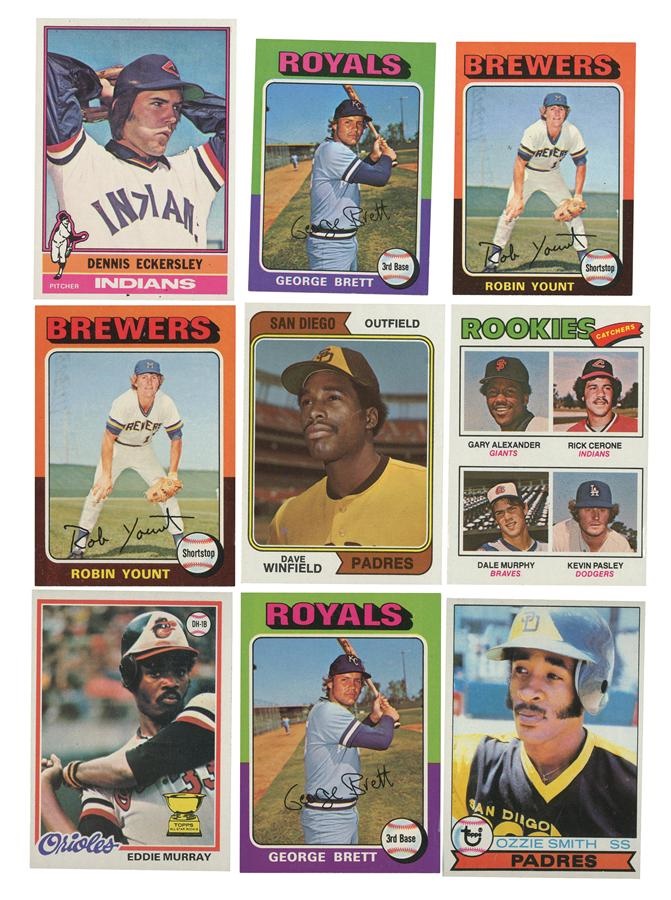 These sets look as if they were put together in the 1970s and stashed away until now. They include 1974 Topps NRMT overall, Keys: #456 Dave Winfield (R) NRMT, 1975 Topps Full Size NRMT overall, Keys: #223 Yount (R) NMMT, #228 Brett (R) NMMT, 1975 Topps Mini NRMT overall, Keys: #223 Yount (R) EX-MT, #228 Brett (R) NRMT, 1976 Topps NRMT overall, Keys: 98 Eckersley (R) NRMT. 1977 Topps NRMT overall, Keys #476 Murphy (R) NRMT, 473 Dawson (R) NRMT, 1978 NRMT overall, Keys: #36 Murray (R) NRMT, 1979 Topps NMMT, Keys: #116 Smith (R) NRMT.
