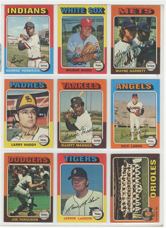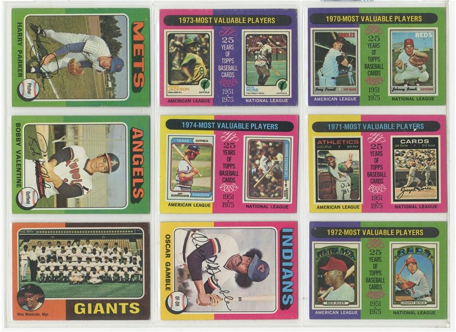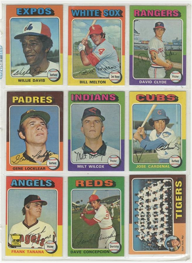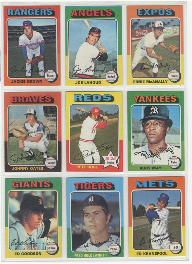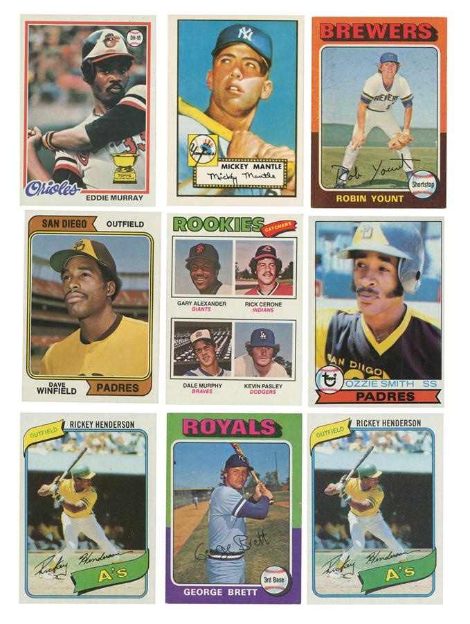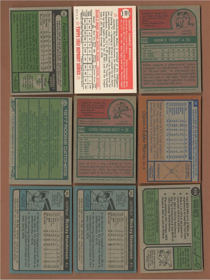 A near complete run of sets from 1974 to 1980 with an added 1952 reprint as a bonus. Sets are as follows: 1952 Topps Reprint set NRMT in original Box, 1974 Topps Set NRMT overall. Keys: #1 Aaron EX-MT, 20 Ryan EX-MT, 283 Schmidt NRMT, 456 Winfield (R) NRMT, 1975 Topps EX+ overall. Keys: #223 Yount (R) EX, #228 Brett (R) EX+, 1977 EX-MT Overall. Keys: #476 Murphy (R) NRMT #650 Ryan EX, 1978 NRMT Overall. Keys: #36 Murray MINT, 1979 NRMT Overall. Keys #116 Smith EX-MT.