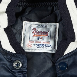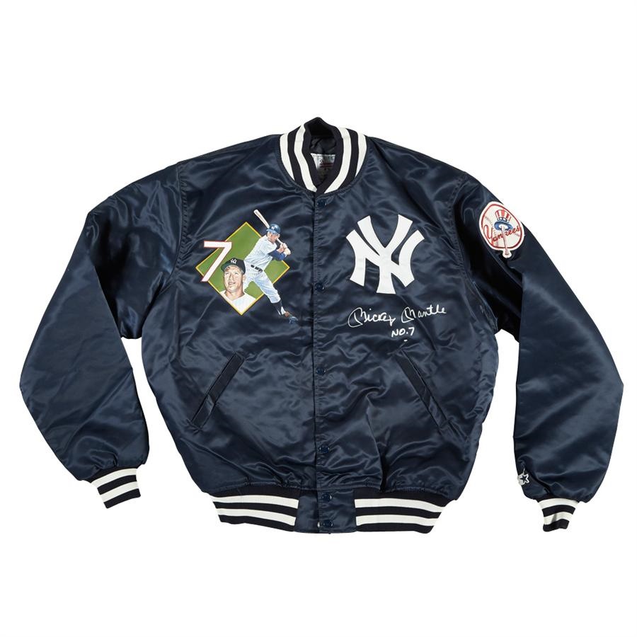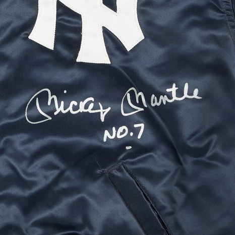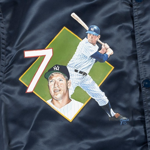 He's the legendary Yankees center fielder and she's the famous Upper Deck memorabilia artist. Together, they collaborated on this striking jacket from Starter's Diamond Collection. There's a huge silver Mickey Mantle Signature (7" wide) with No. 7 inscription below on the left chest below the giant NY, while Josie's two-tiered depiction of Mantle, both his head shot and batting stance along with #7, is featured prominently on the right breast. The signature rates 10/10 an a NMMT jacket.