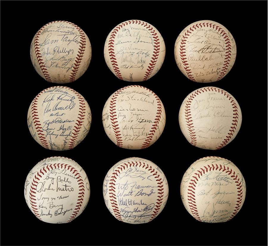 From the Fabulous '50s come these outstanding team baseballs, including the Cleveland Indians from 1950, 1953 and 1961, the 1950 Detroit Tigers, 1965 Chicago White Sox, 1969 L.A. Dodgers, 1969 Twins, 1958 Chicago Cubs and 1956 Kansas City A's. All are in nice shape, averaging EX-MT-NRMT overall.