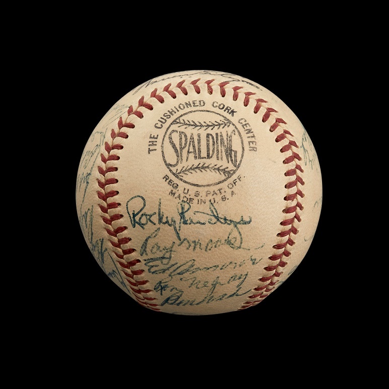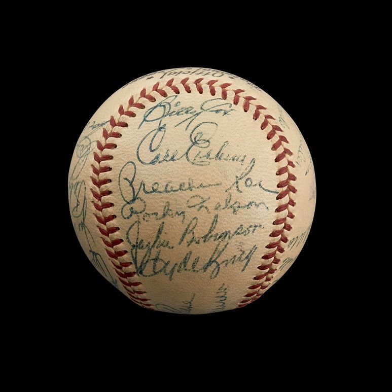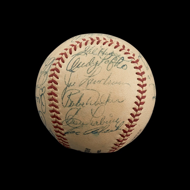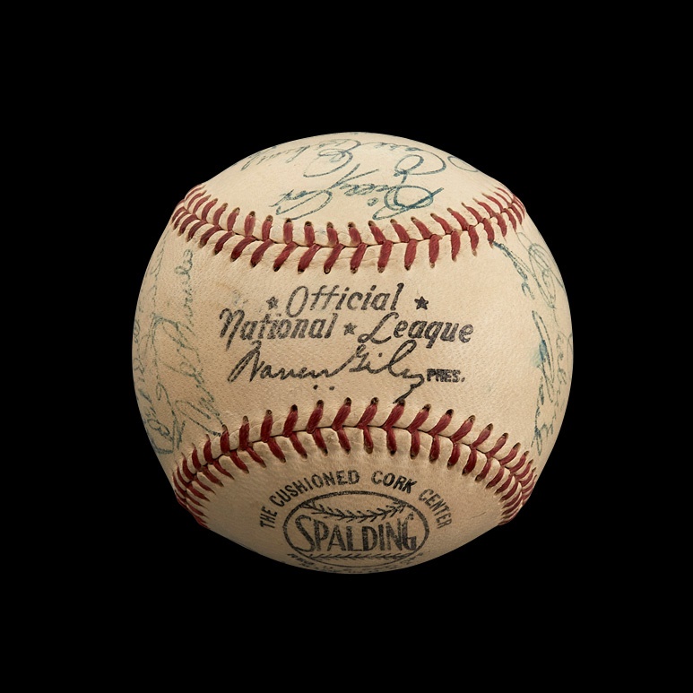 The 1952 season was a series of highs and lows for the Brooklyn faithful. The team rebounded nicely from the devastating Bobby Thomson shot the previous fall, outdistancing the rival Giants by four games to reclaim the pennant. However, their crosstown nemeses, the Yankees, delivered another painful October jolt, winning the World Series in seven games. This official National League (Giles) baseball features 26 signatures, including Roy Campanella, Jackie Robinson, Pee Wee Reese, Duke Snider and Gil Hodges. Signatures average 8 or better on a toned NRMT ball with strong stampings.