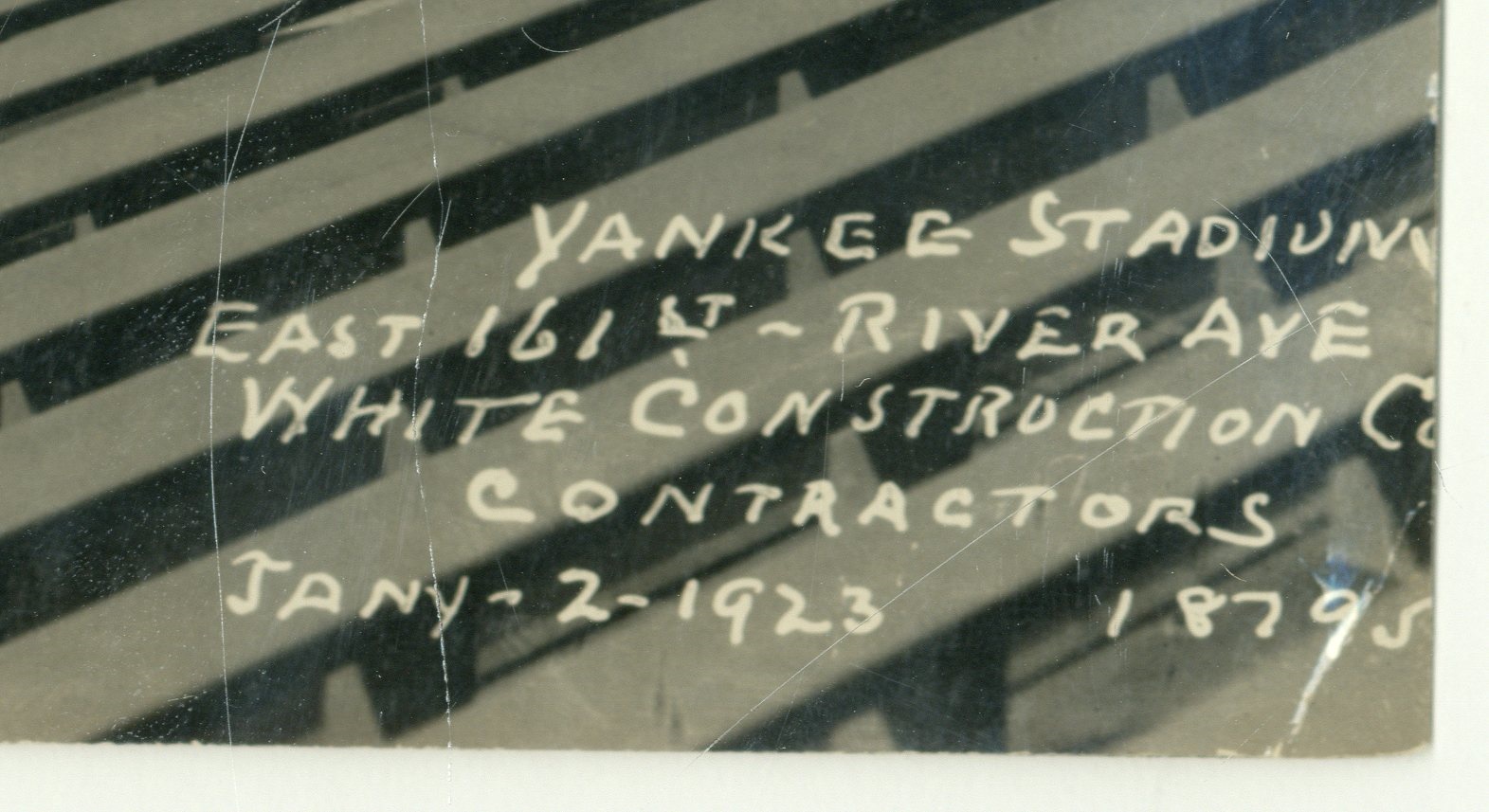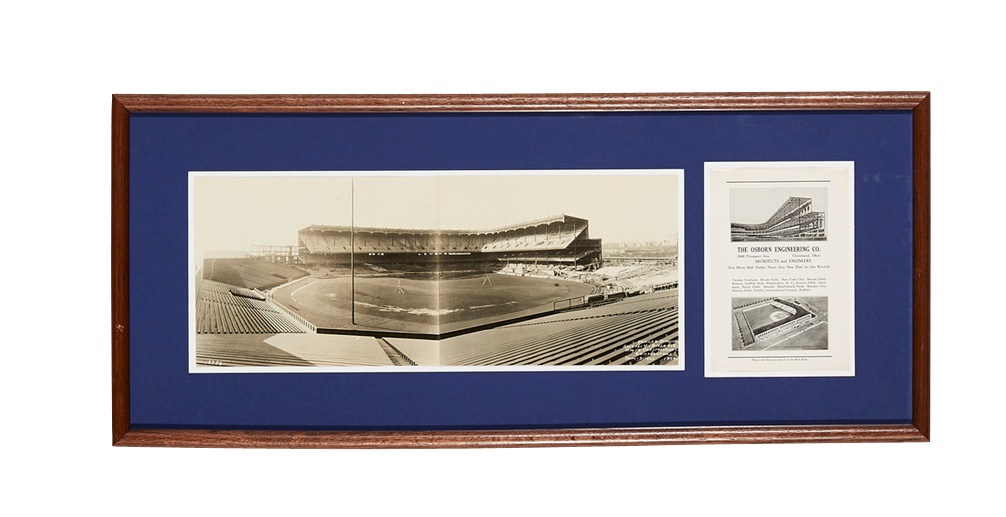 Behold the House That Ruth Built - before it was built! Months before a single fan ever walked through the turnstiles or a batter had stepped to the plate, Yankee Stadium was just a brand new building on the second day of 1923, still under construction but bounding with endless possibilities and a storied future. Just to put things in perspective, the franchise that would become the model for all American sports hadn't even produced a world championship on the day this exceptional panoramic was shot. Printed by White Construction Contractors, there is also a pamphlet from the architects, Osborn Engineering Co. The photo has a center crease from having been folded but otherwise is beautiful with sharp contrast and grades EX-MT. The entire framed display measures 32" x 14".