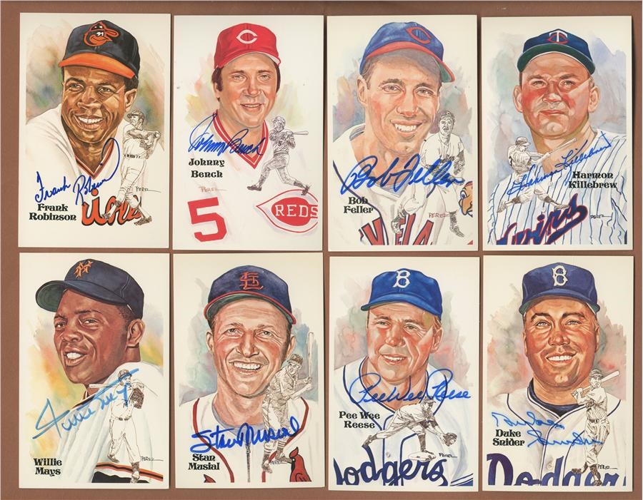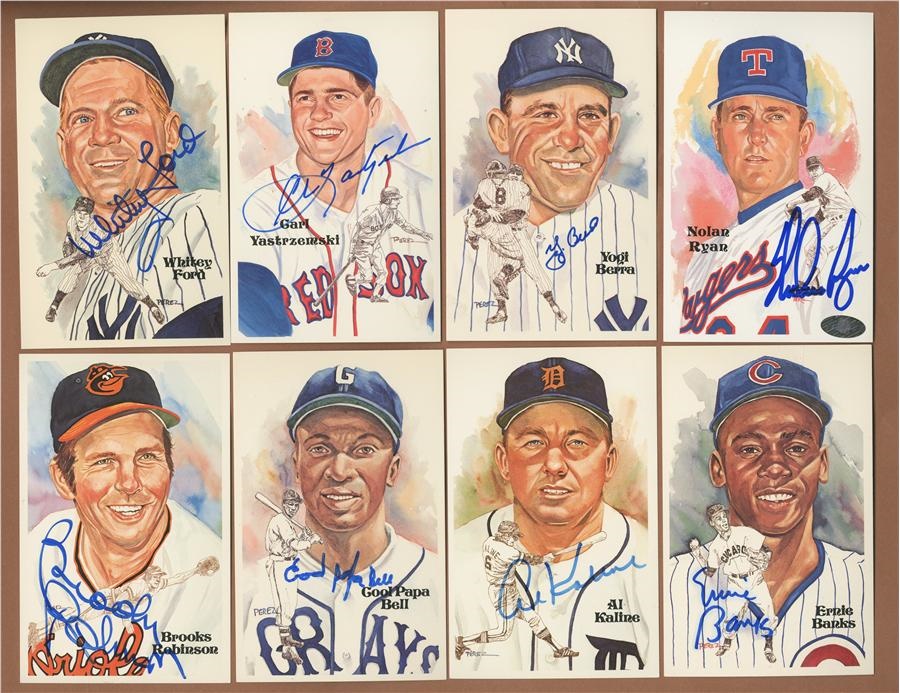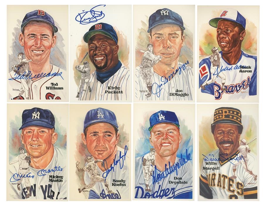This set of Perez-Steele full color postcards features Mickey Mantle, Ted Williams, Joe DiMaggio, Kirby Puckett. Willie Stargell, Don Drysdale and Sandy Koufax among others. All the cards are in NRMT condition with the signatures averaging 9 out of 10, These beautiful watercolors of players were hand- painted by Dick Perez. with player information and card numbers on the back. The lot also contains the rest of the set (NRMT) and original boxes.