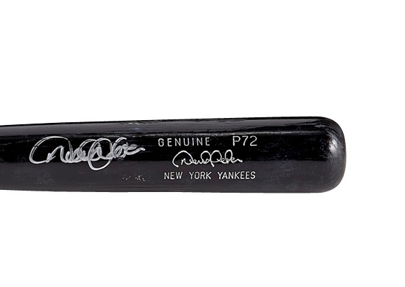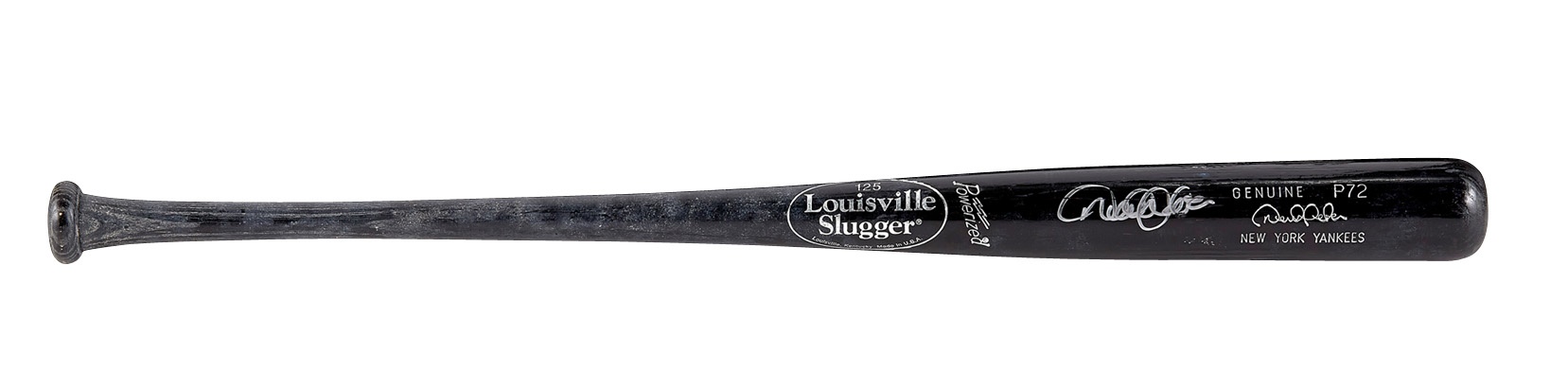 Five-time World Series champion and 13-time All-Star shortstop Derek Jeter swung this bat in game action, circa 2007. The black, uncracked Louisville Slugger measures 34", weighs 32 ounces and shows fine use with seam marks and blue ball label marks. There's Mota stick on the handle and it is signed in 8/10 silver on the barrel. Somewhat surprisingly, the Yankees captain is the lone Yankee to record 3,000 hits with the storied franchise.