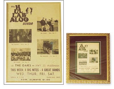 1966 Castiles concert poster features the band in Middletown, New Jersey at the Hullabaloo Club, a chain of teen clubs named for the popular music television show. From the November 3, 1966 performance of The Castiles, it pictures Bruce Springsteen as a young guitarist on stage. Also pictured on this poster, and playing the following night, are The Shadows featuring an incredibly young and very "Little", Steven Van Zandt. It was on one of these evenings that the two would meet and form the basis for the E Street Band and remain best of friends for over 30 years. This is the only specimen of this poster extant. In fact, it is amazing that it was even produced in the first place. Such elab-orate posters were rarely if ever made for these teen club shows in the 1960s. The poster was pictured in a seminal 1995 Goldmine article featuring the rarest concert posters. Poster is 12x17" and is framed to overall 22x27". Poster is very good with some scuffs and wear.