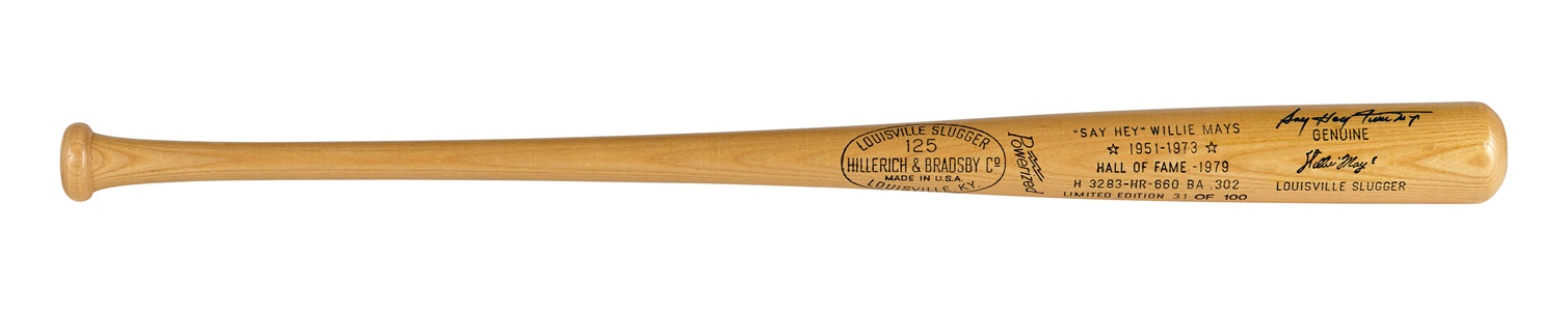 Arguably the greatest all-around ballplayer in history, Willie Mays was just as formidable in the field (12 Gold Gloves) as he was at the plate (3,283 hits, 660 HR, 1,903 RBI), and this special bat numbered 31 of 100 is distinguished by a very rare version of his signature: "Say Hey Willie Mays." The Hillerich & Bradsby Model 125 is in NRMT condition and the Hall of Famer's signature in blue Sharpie rates 9/10.