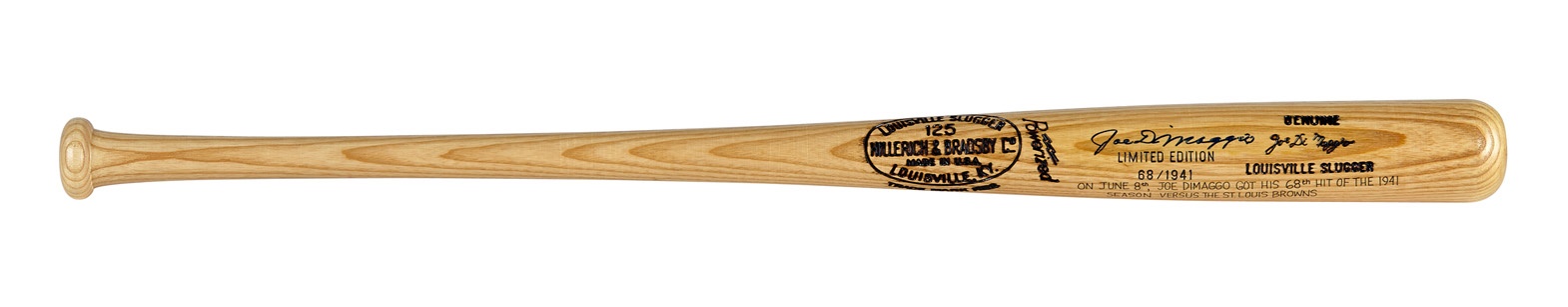 From that amazing season that saw Joltin' Joe DiMaggio cement his legacy with a record 56-game hitting streak en route to the MVP award, this limited edition is number 68 of 1941 but is one of a select few that has a special message inscribed: "ON JUNE 8TH, JOE DiMAGGIO GOT HIS 68TH HIT OF THE 1941 SEASON VERSUS THE ST. LOUIS BROWNS." The bat is in NRMT condition while the signature grades 9/10. We also have a signed lithograph with the same number in this auction. DiMaggio and his Yankees went 101-54, won the pennant by a whopping 17 games and breezed past the crosstown rival Brooklyn Dodgers in five games for their ninth World Series title.