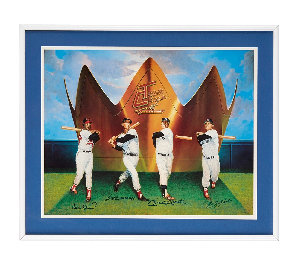 Prior to Miguel Cabrera in 2012, the last Triple Crown winner in baseball was Carl Yastrzemski 45 years earlier. This framed Ron Lewis creation litho from 1986 commemorates the four Triple Crown winners between 1942 and 1967, including Yaz (1967), Mickey Mantle (1956), Frank Robinson (1966) and Ted Williams (1942, 1947), Measuring 29.75" x 24.75" in its frame, the print is in NRMT condition and features signatures from the quartet which average 8-9/10.