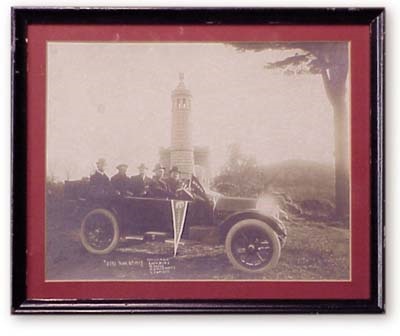 Now this is really strange. Yes, that's a young Connie Mack with Eddie Plank and a few other guys in this car, sporting a pennant not-ing their recent World Championship, but check the other pennant flying. It reads, "Oakland." Is that freaky or what? Photo is in great condition, EX+ or better. (9x11" framed)
