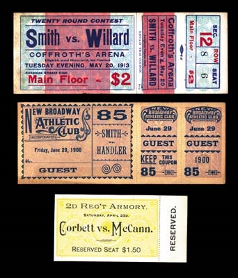 Three great full, unused tickets include Billy Smith vs. Jimmy Handler at New Broadway Athletic Club (1900), Jess Willard vs. Gunboat Smith at Coffroth's Arena (1913), and Corbett vs. McCann at the 2nd Regent Armory. It is unknown whether this is James J. or Young Corbett. EX-MT overall.