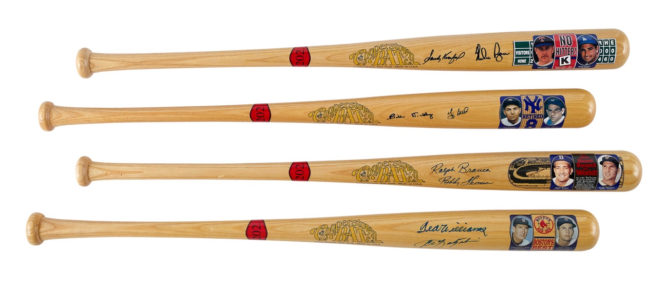 20 years ago, the Cooperstown Bat Company produced this set of four dual-signed bats featuring terrific barrel graphics depicting the feats in question. These are: Boston's Best" (Ted Williams/Carl Yastrzemski), "No Hitter!" (Sandy Koufax/Nolan Ryan), "The Shot Heard Round the World" (Ralph Branca/Bobby Thomson) and "NY Retired 8" (Bill Dickey/Yogi Berra)," which is exceedingly rare since Dickey did not sign many of this set due to failing health. Each bat has on "135 of 202" stamped on the knob. The bats are NRMT and the signatures rate 8-9/10.